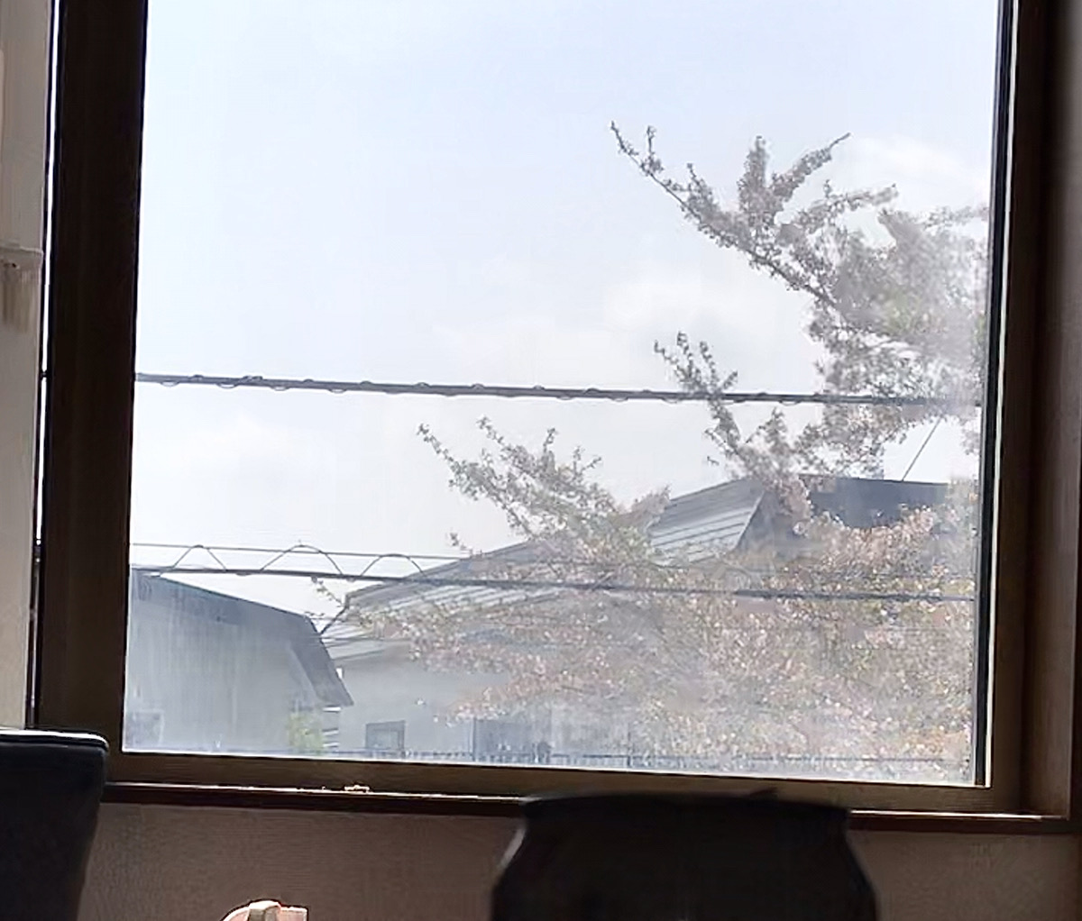プッシュっとプルタブを開けて休憩していると、カーテンがないから家の向かい側の家にある桜の木が綺麗に。