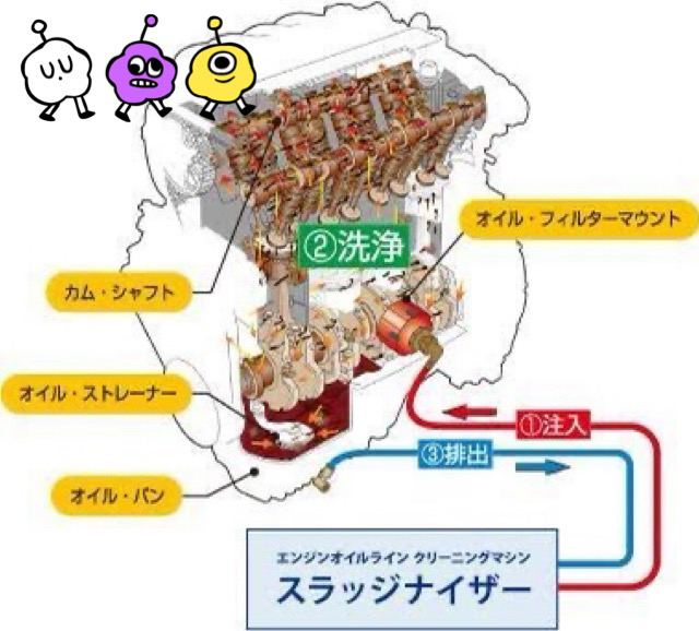 エンジンオイルライン洗浄とは、エンジン内に洗浄剤をポンプで循環させ、